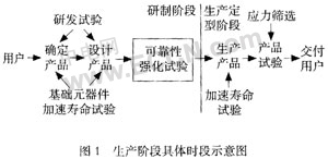 可靠性强化试验是破坏性试验,目的是要引起失效,试验样品针对少量的抽样产品进行,进行试验的时间设在设计周期的末期,设计、材料、元器件和工艺等都准备就绪,生产还没有开始之前,在产品研制生产阶段的具体时段如图1所示。