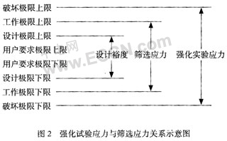 用户提出的技术要求为没计规范的极限应力;设计人员按照一定的设计裕度进行传感器设计,即为设计极限应力;传感器在工作极限应力范围内不应产生失效,筛选应力低于工作极限应力;传感器在破坏极限应力范围内不会出现不可逆的失效,可靠性强化试验应力强度不可超过破坏极限应力,关系如图2所示。