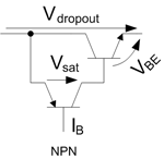 NPN 晶体管透过 PNP 晶体管从输入电轨接收驱动电流。基极驱动电路将它的发射极电流并入输出电流,因此 NPN 稳压器的静态电流不大。这项技术也需要较低输出电流来进行调节。范例装置:TLV1117 |