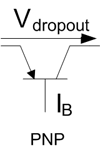 基极驱动电流流向地面。这个接地电流的值与导通组件晶体管的增益有直接关系,因此,PNP 稳压器的静态电流高于 NPN 稳压器。范例装置:TL5209 |