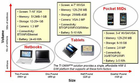 MID 分为三大类,第一类是显示屏尺寸约为3至4英寸、重量约为0.25磅的袖珍型产品;第二类是显示屏尺寸约为4至7英寸、重量约为0.5磅的平板型;第三类是上网本,显示屏尺寸约为7至10英寸,重量约为1磅。小型 MID 代表了智能电话的发展方向,上网本则是笔记本电脑的“瘦身”版。平板产品是一种新兴组合,定义还不完善,因而还潜藏着很大的创新空间。诸如便携式导航设备与便携式媒体播放器等传统消费类电子产品预计将增加移动因特网支持功能,从而也归入平板型产品的范畴。