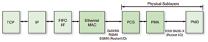 通信协议中的PHY层通常使用的是PCS、PMA和PMD子层。图2显示的是在局域网应用中使用赛灵思TEMAC (10M/100M/1G) LogiCORE的示例,其中千兆位以太网MAC接连与1000BASE-X PCS/PMA和激光收发器1000BASE-X PMD进行通信。此时,PHY同时实施在了FPGA和可选的光学收发器器件之中。