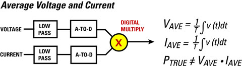 图3说明了一种动态功耗测量的替代方法。通过增加转换器输出的瞬时电流和电压,然后执行A-D转换的平均,就可以消除大多数动态误差。