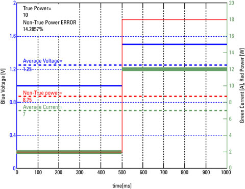 图2显示了这种方式可能受到大误差影响的结果。实例波形每秒都在重复。固定蓝电压波形阶跃为1V至1.5V,反电压间隔为500ms,平均电压为1.25V,以蓝色虚线表示。固定绿色电流波形阶跃为2A至12A,平均反向电流为7A,以绿色虚线表示。只要尝试将这两个平均值相乘即(1.25V * 7A)= 8.75W,如红色虚线所示。不过,有效功率是通过固定红色功率波形的平均值表示的。在这种情况下,有效功率高于14%平均电压电流乘积。在需要大或快速动态负载变化系统中,误差可能是相当大的。