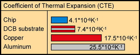 功率半导体模块的特点是它们具有单独的电流和散热路径。不同的材料——绝缘体、导体,当然还有半导体——都必须连接在一起。由于热膨胀系数(CTE)存在差异,在温度和功率循环中,相互连接的材料之间会产生机械应力。该应力与材料CTE的差异,刚性连接的长度以及超温∆T成正比。因此,功率模块必须被设计成能满足给定应用的热应力要求。为了符合这一要求,新模块采用了新的焊接材料,以便在DBC和半导体的CTE差异中进行折衷。