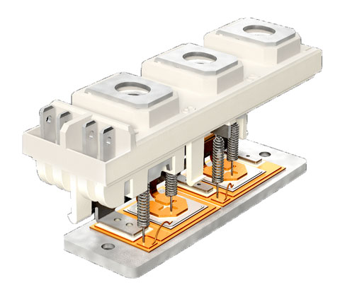 正如上文所述,在被动的热循环期间,焊层是至关重要的。基于这个原因,新一代模块中,DBC、衬底和栅极/辅助阴极端子间是通过弹簧进行压接。这种类型的连接易于安装,无需额外的焊接,并且可用于各种电流范围。弹簧针触点已被证明具有良好的长期可靠性,非常适合用于电力电子应用中。