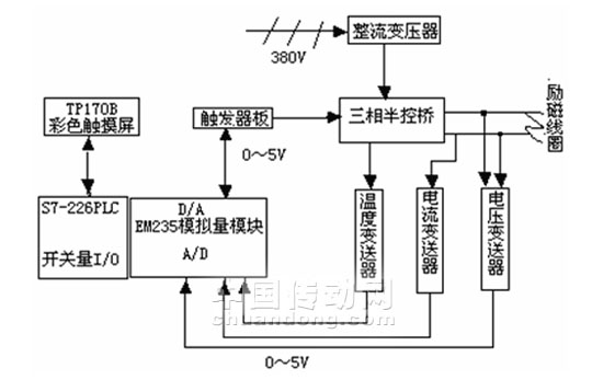可控硅整流输出直流电压,0~45V连续可调;输出直流电流,0~1600A连续可调。由传感器对主路硅元件的温度进行采样,所测温度信号经放大和A/ D 转换后送PLC,利用软件进行数据处理,处理后的数据送HMI进行实时显示。在HMI 上设置超温报警及超温跳闸温度限定值。当主路硅元件温度过高,超过限定值时,PLC 将输出超温报警信号和超温跳闸信号,并在HMI 上显示出具体信息。同时对励磁线圈的电流和电压进行精确的PI控制,可在HMI上设定PI算法的参数值。该系统中的数据采集处理、风机运行和故障报警由PLC 和HMI 通过编制相应的软件来完成。