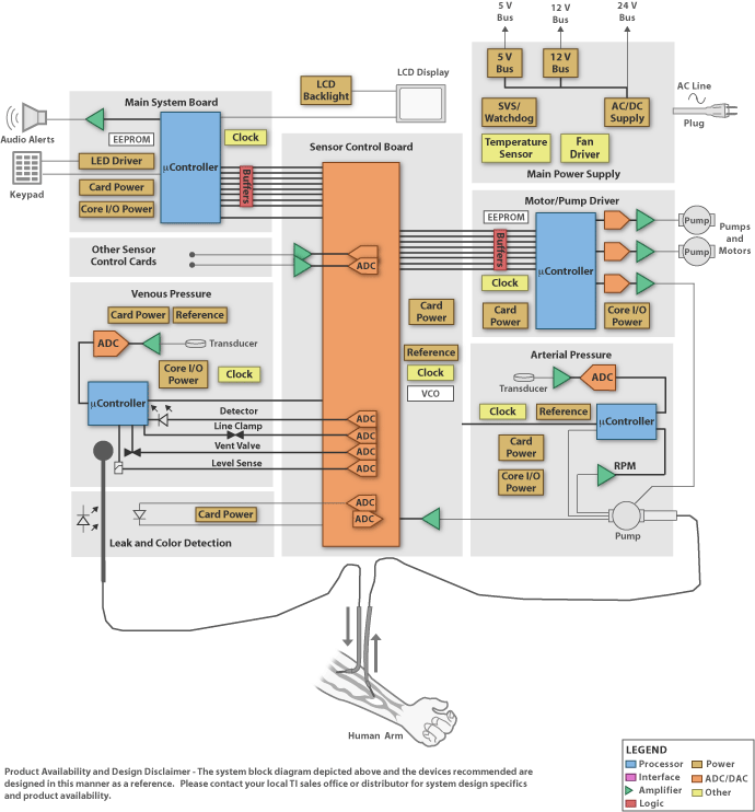 动脉和静脉控制卡:系统的这些部分可能包含如下功能:动脉和静脉压力传感器、血泵、管夹、液位传感器、血液检测传感器和各种其它监控和控制功能。自从 TI C2xxx DSP 面向电机驱动和工业传感器应用以来,它们就成为这些领域的理想微控制器选择。它不仅提供驱动和诊断功能,还能够实施 RPM 和电机线圈电流传感以及读取压力变送器数据。同时还可以在较小的成本影响下支持系统中所需的冗余。