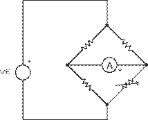 Wheatstone 桥接的原理是:如果交叉分支的三个电阻和电流均已知,则可计算得到第四个电阻。使用一个高灵敏度电流计,可以非常精确地探测到零电流,因此能够非常精确地实施测量。所以,当电流为零时,桥接获得平衡,而第四个电阻与其他三个电阻相等——但只有在这三个电阻都相等的条件下,如图 2-3 所示。