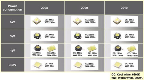 大功率LED发光器是LED照明灯具的一个核心元件,因为其光效是决定LED照明灯具性能的关键因素。目前,该公司可以提供1W工作的90lm/W大功率LED,预计在2009年第二季度提供1W工作的100lm/W LED。