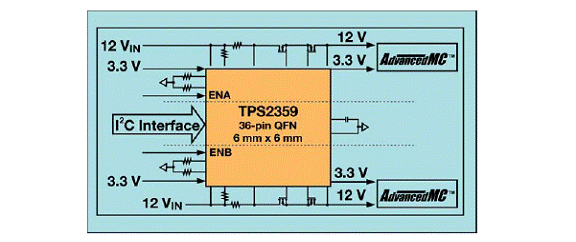 在迅速地扩大采用 ATCA 及 MicroTCA 之后,设计人员则面临智能型集成在严格的要求与时机方面的挑战。如图 3 所示,TPS2359 是一款双插槽 AdvancedMC 热插拔控制器,这类器件都是通过一个集成电路进行多个通道的控制和热插拔功能的。