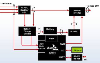 BF50x处理器的优化设计确保能实现UPS系统的准确、无波动的电源控制,提供对负载变化准确分析、负载瞬时改变以及失载事件进行准确预测。BF50x所内置的3相PWM单元可以实现先进的电源切换,因而UPS系统能动态地对各种负载条件下的非线性负载做出动态响应。同时,BF50x处理器本身还具有控制功能,可以实现启动/关断控制和电压调整。