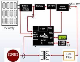 在将太阳能发电和风能发电的电能接入到商业电网中或者提供给本地电网时,BF50x处理器是执行复杂算法使逆变器能将可变的直流输出转换成“干净”的电流和稳压源的理想之选。BF50x在设计中针对可再生能源应用和智能电网应用进行过优化,其强大的处理能力可以确保实现非常高效率的能量转换和传输,能实现先进的能源切换控制功能,并支持反孤岛技术以及较大功率点跟踪功能。