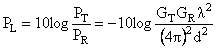 其中PT是发射功率;PR(d) 是接收功率,也是发射机与接收机距离d的函数;GT是发射机天线增益;GR是接收机天线增益;d是发射机与接收机的距离,单位为公尺;λ则是波长,单位也是公尺。