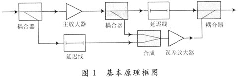 前馈技术由贝尔试验室的H.s.Black提出,早期因其本身的特点,如:开环电路导致器件特性随时间变换不能被补偿;在整个频带内电路的转移特性要求严格;前馈的实现需要辅助放大器,提高了成本和设计复杂度等问题而没有被重视。随着对线性化技术研究的深入,其固有的诸多潜在优点也逐渐被大家所认可。前馈技术的基本原理框图如图1所示,由于在前馈放大器的设计中,合适的耦合因子的选择以及辅助放大器本身的特性漂移等对误差信号的抵消有着极大的影响,因此,在实际设计前,应对电路进行仿真设计,并根据仿真结果确定是否需要增加自适应调整电路。