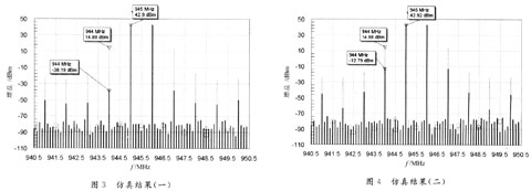 仿真设计中采用一个输出功率约80 W的LDMOS功率管作为仿真的基础器件,着重仿真在一定的功率回退基础上,误差放大器的增益漂移对整个前馈电路的影响。并根据仿真结果得出在预期的交调失真抑制目标下,该误差放大器可以承受的增益改变。为了简化仿真过程,在仿真中忽略了功率管等器件的插入相位问题。图2,图3为基本的仿真电路图及仿真结果,从结果中可以看出,在合适的耦合因子和增益下,前馈可以较好地改善交调抑制结果。