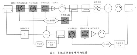 在误差放大器回路中增加可调衰减器,以仿真误差放大器的增益波动,从图4的仿真结果可以得知,在误差放大器的增益波动±0.2 dB的情况下,交调抑制结果变差了将近26 dB。同样地,主放大器的增益波动,也会导致输入误差放大器的信号对消不理想,甚至失效,从而影响到交调抑制的改善结果。因此,为降低对主放大器和误差放大器的设计要求,并在一定程度上满足目前对多载波系统的设计要求,可在电路中增加自适应调整电路,其框图可构建成如图5所示的电路。