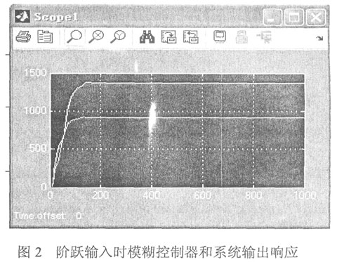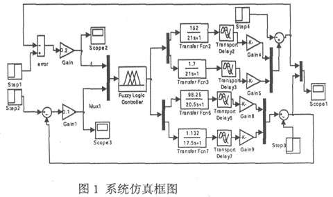 在MATLAB的命令窗口输入simulink命令,在simuink环境下,结合系统提供的其它功能模块设计完成模糊控制系统。进行仿真前把matlab中的文件hzykz01.fis加载到模糊控制器模块中,仿真结构图如图1所示。设定好仿真时间、步长等各项参数,即可开始仿真。仿真结束时,仿真结果可以通过示波器直接观察。