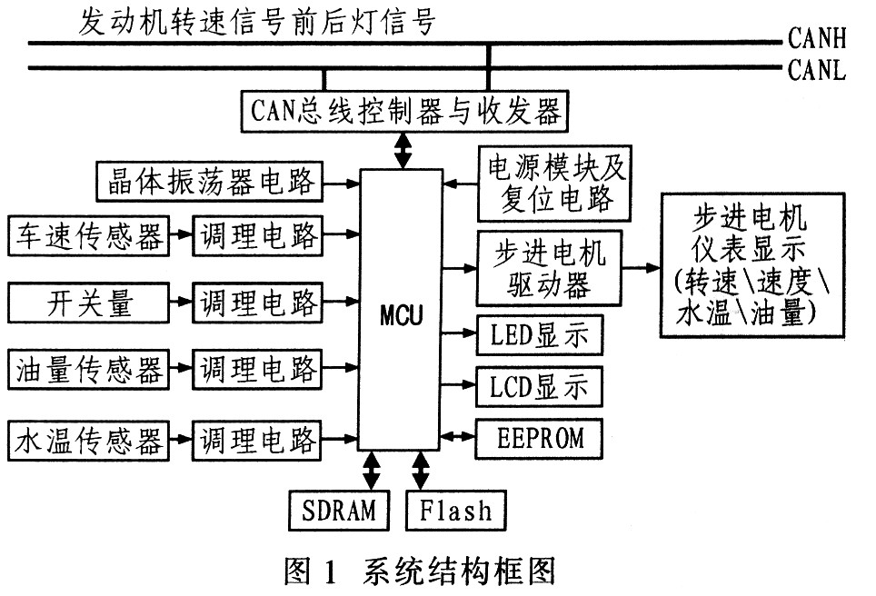 汽车仪表需要处理的信号主要有:车速、发动机转速、水温、油量、以及各种开关量或报警信号。其中,发动机转速信号和前后灯信号是从CAN总线(发动机电控模块和前后灯电控模块)获取,而车速信号、水温、油量和其他开关量信号从相应的传感