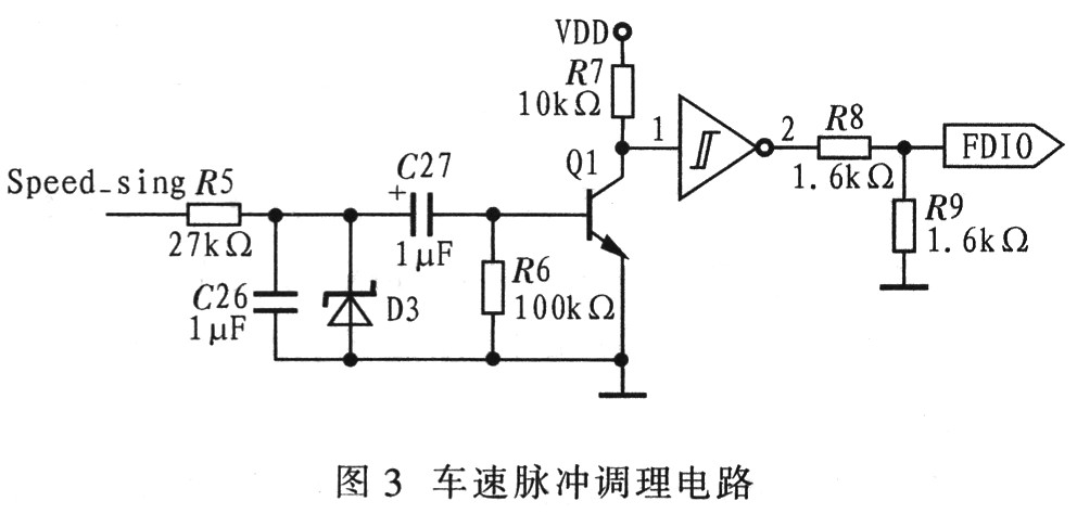 由于汽车大多工作在恶劣环境下,将干扰车速传感器信号,因此在输入至中断端口EINT0前需要对车速脉冲信号进行处理,这里采用RC滤波、三极管放大以及斯密特整形方法调理车速脉冲信号。车速脉冲调理电路如图3所示。
