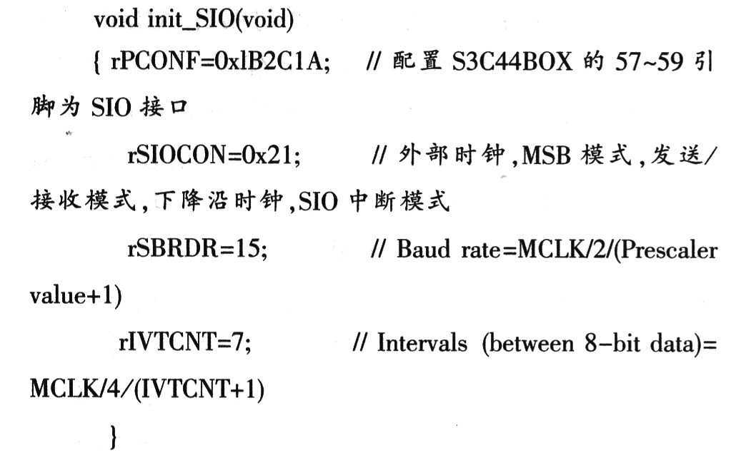 由于S3C44BOX的SIO接口的引脚与标准I/O端口复用,因此首先必须设置S3C44BOX的引脚57~引脚59为SIO接口,然后再通过配置SIO模块对应的寄存器,使得SIO时序与MCP2510的SPI接口协议一致,可通过以下初始化SIO函数实现。