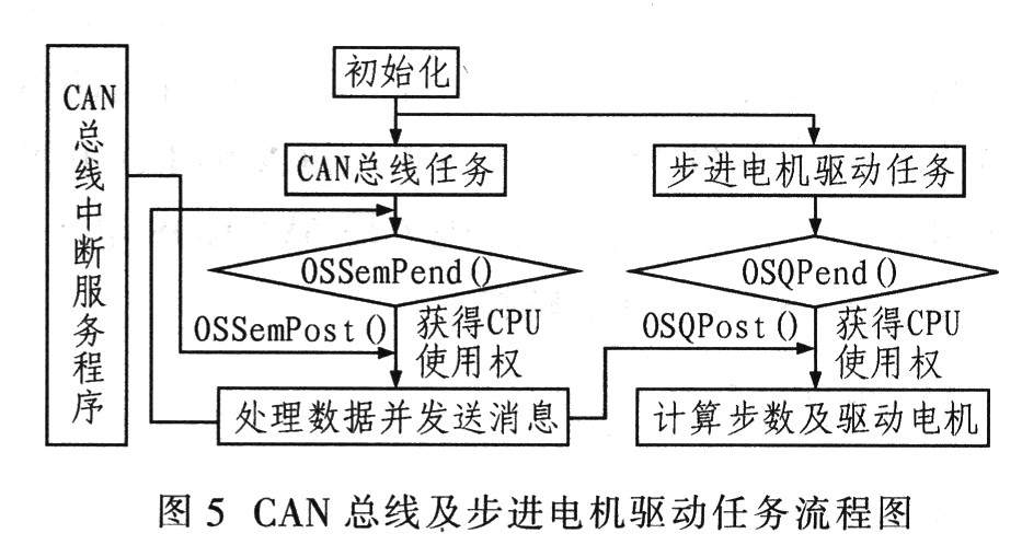 如图5所示,初始化完成后,主程序发起CAN总线任务及步进电机驱动任务,两个任务先后进入等待信号量和等待消息队列,CAN总线发生中断后,中断服务程序释放信号量,使得CAN总线任务进入就绪状态,在其获得CPU控制权后,处理数据,然后将数据发送至消息队列,从而使得步进电机驱动任务进入就绪状态,电机任务通过任务调用获得CPU使用权,再根据消息队列中的数据计算出所需的驱动步数,驱动电机旋转。