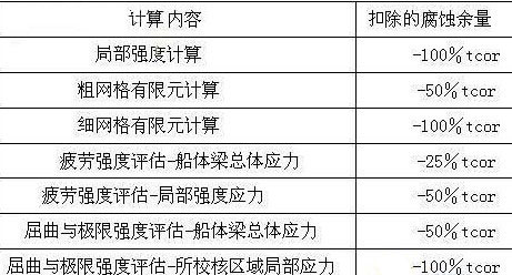 结构共同规范对构件表面的腐蚀余量作了明确的规定。关键的问题在于不同的计算扣除不同的腐蚀余量,结构共同规范规定在进行船体梁屈服校核、屈曲校核,船体梁极限强度校核,船体梁弯矩和剪力引起的应力计算,强度直接计算和疲劳校核时都要扣除不同的腐蚀余量。也就是说舱段有限元模型的建模尺度应基于净尺度。表1列举了部分计算的模型的腐蚀余量扣除标准。