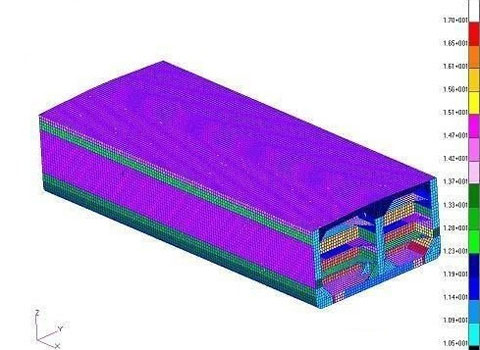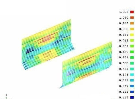 图3、图4为有限元计算的模型和分析结果示意图。结合ABS船级社的分析评估软件,对于11万吨油轮有限元计算结果进行评估,并对船体的相应结构进行修改。总的来说新的规范生效以后,由于载荷要求的提高,船体各部分的构件尺寸都有一定程度的增加,包括外板、内底板、纵舱壁等,局部结构主要是屈曲的要求不满足,主要措施是增加板厚,局部加CARLING来满足要求;对于横舱壁附近的中纵舱壁,由于剪切的影响,局部强度不够,考虑增加板厚。