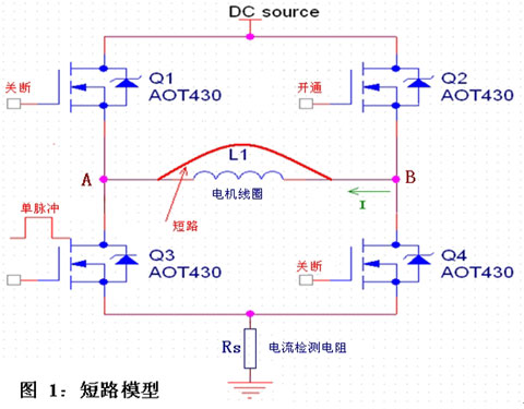 短路模型如图1所示,其中仅画出了功率输出级的A、B两相(共三相)。Q1和Q3为A相MOSFET,Q2和Q4为B相MOSFET,所有功率MOSFET均为AOT430。L1为电机线圈,Rs为电流检测电阻。