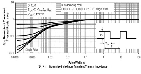 由图3较下面一条曲线(单脉冲)可知,对于单脉冲来说,要想获得0.015的热阻系数,其脉冲宽度不能大于20μs。