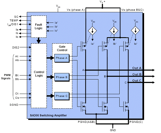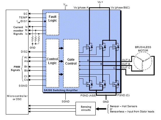 The SA306 is a fully integrated switching amplifier designed primarily to drive three-phase Brushless DC (BLDC) motors. Three independent half bridges provide over 15 amperes peak output current under microcontroller or DSC control. Thermal and short circuit
