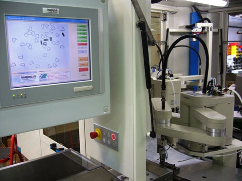 当零件到达反馈装置时,视觉系统需要一幅图像并将可挑选的零件进行定位。定位信息传送给机器人,这样机器人就可以捡起这个零件,而且能精确地把它放在指定位置,误差不会超过0.02 mm。
