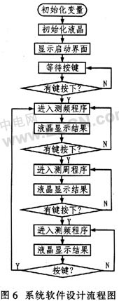 系统软件设计流程为:单片机初始化、LCD初始化、计数器清零、单片机发出启动脉冲,来启动CPLD的两个低16位计数器和单片机的两个高16位计数器。此时,计数器并不开始计数,直到下一个Tx上升沿到来,计数器才开始计数,软件延时1 s后,发出结束脉冲来结束CPLD的两个低16位计数器计数,但此时,计数器并不停止计数,而是直到下一个Fx上升沿两个计数器才都停止计数,随后关闭单片机的两个计数器。CPLD发送结束信号,单片机响应中断。中断函数分两次读取CPLD的两个计数器值。进而单片机处理两个32位计数器值。调用显示函数显示频率,从而完成一次测频。图6为系统软件设计流程图。
