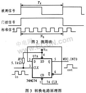 智能化仪器通常以单片机为核心,而一般单片机自身计数器/定时器的计数/定时范围或精度有时无法满足系统要求。以89C51单片机为例,当其内部两个16位计数器/定时器T0和T1工作在计数方式时,对T0(P3.4)或T1(P3.5)的外部脉冲进行计数。当T0或T1引脚上发生负跳变时,计数器加1。由于识别引脚的负跳变需2个机器周期,即24个时钟振荡周期。T0/T1的较高频率为1/24fosc,当晶体振荡器频率为12MHz时,其较高计数频率为500 kHz。要求高测量频率时,则需对被测信号预处理以扩展测频范围。