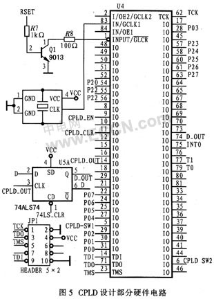 利用CPLD作为计数器的低16位,而89S51内部计数器作为计数器的高16位,在门控时间内分别对被测信号和标准信号进行计数。由于单片机具有程序运算能力,且频率为周期的倒数(f=1/T),则测频法与测周法互通。CPLD设计部分的硬件电路如图5所示。