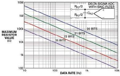图 1 描述了该公式的特征,其中 ER 为 ADC 厂商产品说明书的规定有效精度。如果您在 200 Hz 数据速率下运行您的 23-bit 有效精度 Δ-Σ 转换器,则滤波器电阻的较大值为 4.297 kΩ 或者更低,而 RFLT/2 为 2.148 kΩ 或者更低。
