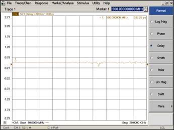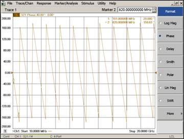 trace来测量出延迟线标准件与直通标准件的相位差,根据相位差从20度到160度,我们可以确定相应的频率范围,如图3所示,从图3我们可以知道,Line1的频率范围是从101MHz到820MHz,满足我们较初设计时对Line1的要求。同样的,Line2也是采用相同的方法来确定频率范围。此时,也能够测量出Line1,Line2和直通标准件之间的时延差,这将会在新建TRL校准套件时候用到,图4是Line1的时延测量值。