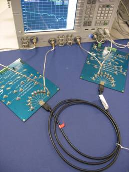 被测件是Display Port电缆,长度为2米。根据Display Port电缆的指标,我们知道频率不超过300MHz时,2米长的Display Port电缆,其损耗大概为2dB,基本上是单位长度上的损耗为1dB。图7即Display port 电缆测量的设置环境,两块PCB板,刚好各自对应半个直通长度。