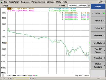 从图8中,我们可以得到Display Port电缆测量的较终结果,当频率为300MHz时,S21=-2.1110dB,接近-2dB,满足相关指标。