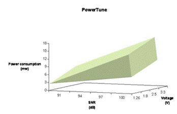 图 1. SNR 及电压的提升将使功耗增加。使用者可以根据自身的应用及系统需求来调节功率。