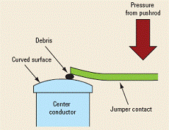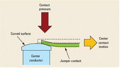 尽管这种设计能够使机械驱动装置的寿命达到几千万次,但仍有许多严重缺陷。搭接片触点和中心导体之间的连续碰撞将会逐渐造成越来越大的磨损,并产生一些碎屑。这些碎屑以及长期积累的灰尘和污染物会一起留在端头上。结果,随着时间的延长,接触电阻将会增加,从而使得插入损耗增加。这不一定会导致开关达不到其射频技术指标,但随着时间的增加,将会对插入损耗可重复性产生巨大影响。在开关的整个寿命期内,这些微粒会在中心导体的表面上不断堆积,其随机性意味着这种故障可能时断时续,无法被检测出来。导致这种不利结果的罪魁祸首正是没有弹性的搭接片触点设计。因此,具有这种设计特性的开关达不到可重复性技术指标或者根本没有可重复性是很常见的事情。