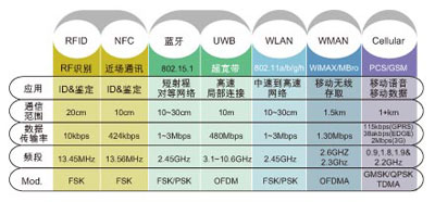 目前市场上有许多标准无线技术,工程师可以从应用范围、数据传输率、频段和功耗方面考虑采用何种技术。例如,WLAN可以提供的通信范围是100米左右,可以提供的数据传输率可以超过54Mbps。而NFC提供的通信范围就是10cm左右,数据率为1~3Mbps,频段则是13.56MHz。表一列出了目前可以实用的标准无线技术