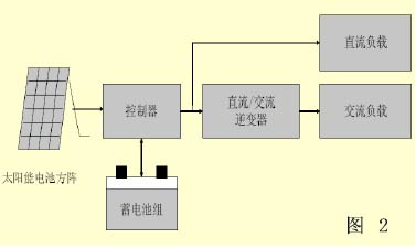 对于城市内照明可靠性要求高的灯具照明,为了增强系统的可靠性,可以采用与市电相结合的方式。图3为系统的原理示意图,该种系统的优点是太阳能发电量不够时可以采用市电进行补充,既节约了能源,又增强了系统的可靠性。