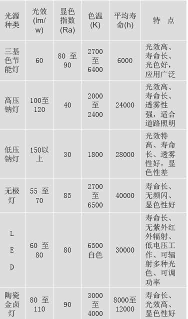 太阳能系统照明的光源原则是选择适合环境要求的光源、寿命长、光效高、显色性好等。常用的光源类型有:三基色节能灯、高压钠灯、低压钠灯、LED、陶瓷金卤灯、无极灯等。需要注意的是尽量选择无需逆变的直流输入光源,由于小型逆变器的效率比较低(一般低于80%),选择直流输入能减少系统的能量消耗。现针对应用较多的太阳能灯具光源加以分析比较: