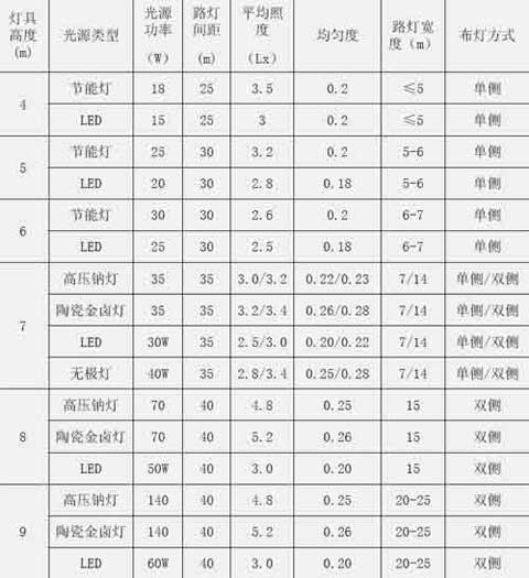 三、常用路灯光源的高度与功率搭配