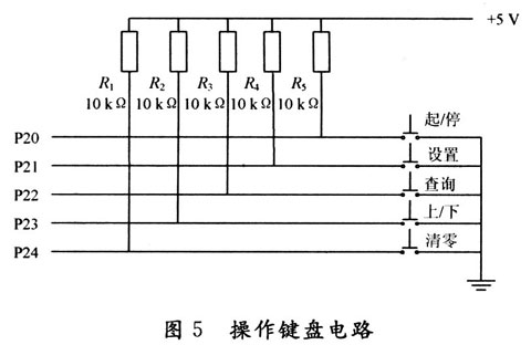 操作面板上共有开始/结束、设置、上/下调、查询、清零5个操作键,其主体电路如图5所示。