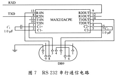 RS 232串行接口是单片机和上位计算机进行通信的必备环节。AT89C55单片机片内包含了一个全双工的可编程的串行I/O端口,在串行通信中采用RS 232标准。RS 232标准的电平采用负逻辑,规定+3~+15 V之间的任意电平为逻辑“O”,-3~-15 V之间的任意电平为逻辑“1”,通信时要将TTL或CMOS电平转换为RS 232电平,本设计采用MAX232芯片来完成电平转换,其电路如图7所示。