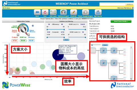 当工程师在WEBENCH Power Architect中输入方案大小、系统物料成本及电源转换效率等参数后,美国国家半导体 WEBENCH Power Architect 的图表分析系统会实时显示出功耗的主要来源、系统的成本及方案大小。工程师可以据此对部分电源和负载进行调整,然后进一步建模和优化,从而确保系统能够达到热管理及电气特性等方面的设计要求。