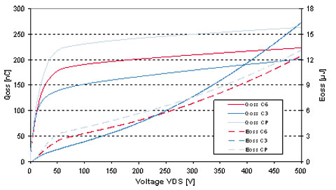 图2:不同器件家族输出电容中存储电荷Eoss(右侧参考轴,虚线)和电荷Qoss(左侧参考轴)之间的比较