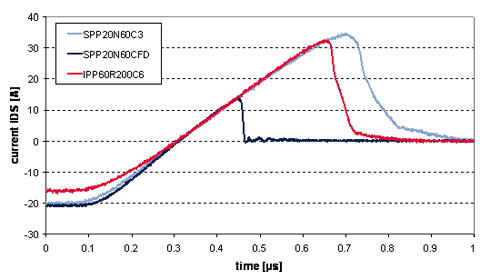 谐振型拓扑结构的另一个十分重要的参数是对出错状态的抗受能力,如对内部体二极管硬换流的抗受能力。例如,LLC变换器在启动和负载跳变期间会出现此类情况。如图3所示,CoolMOS™ C6内部体二极管的反向恢复电荷比C3系列产品下降了大约25%。在进行换流试验过程中,器件表现出了出色的出错状态抗受能力,而且,在开关晶体管和二极管采用同样器件的情况下,CoolMOS™ C6器件几乎不可能被毁坏。因此,在大多数情况下,可以不使用昂贵的寄生了快恢复体二极管型的MOSFET。